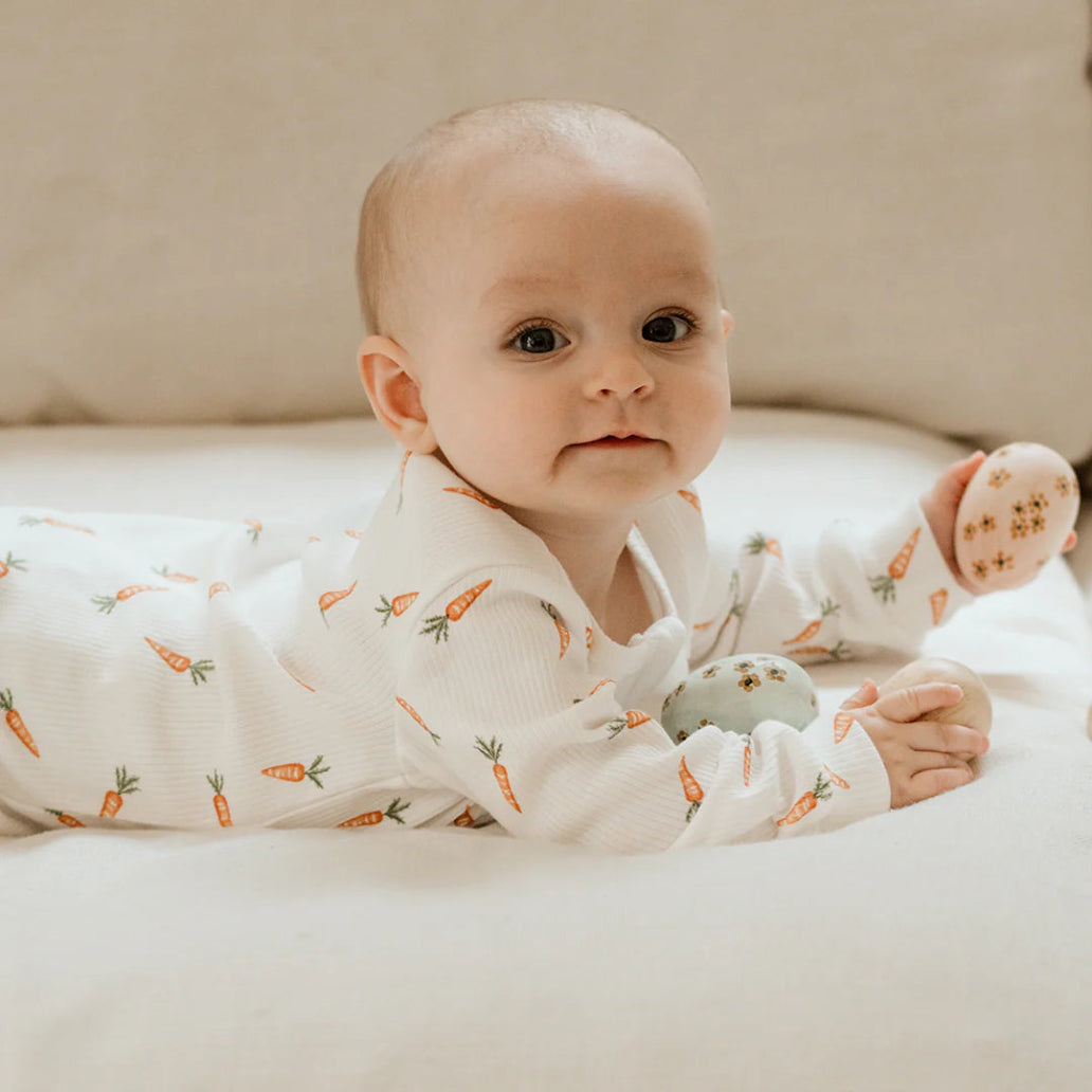 The perfect fit for egg hunts and spring harvest, this footed sleeper features our all-over Carrots print. Made from a soft and stretchy cotton rib, it keeps your little bunny snug without restricting movement. Integrated feet bundle their tiny toes into soft warmth while they explore and the two-way zipper makes nighttime changes easier for everyone involved. There’s coordinating PJs available, making them the perfect choice for family days at home.