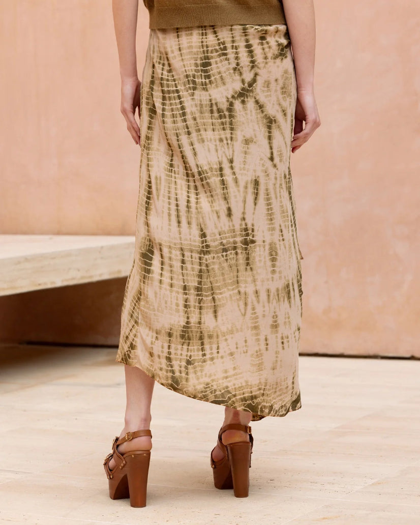 This lightweight, airy pareo skirt is designed as a natural drape around the silhouette. The fluid and delicate fabric reveals a khaki tie & dye on a powder pink background, creating a look that is both soft and contrasted. The front drape creates a beautiful sense of movement, while a discreet side zipper ensures a perfect fit. An elegant piece with a nomadic spirit, easy to pair for a free and refined look.
