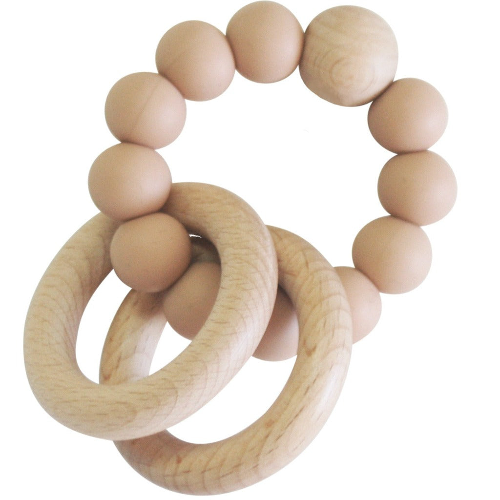 Smooth natural beechwood teether ring set available in three colours. Features easy to grab shape with soft silicone beads to massage sore gums. Modern and practical! Clean with damp cloth, warm soapy water, rinse clean and pat dry. Comes in a cotton gift bag.