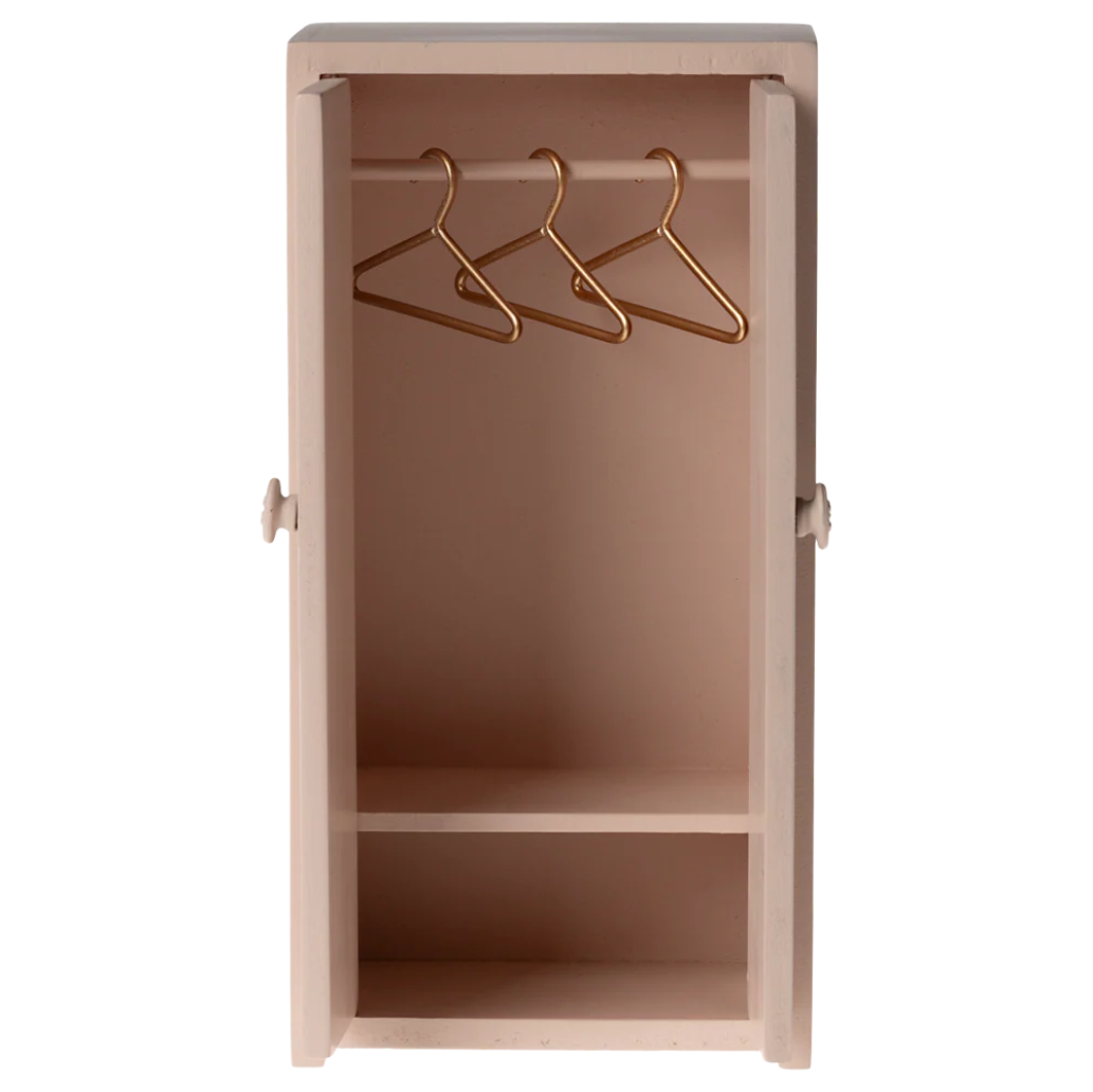 A small closet helps the mice family organize their wardrobe. The closet comes with three golden hangers.