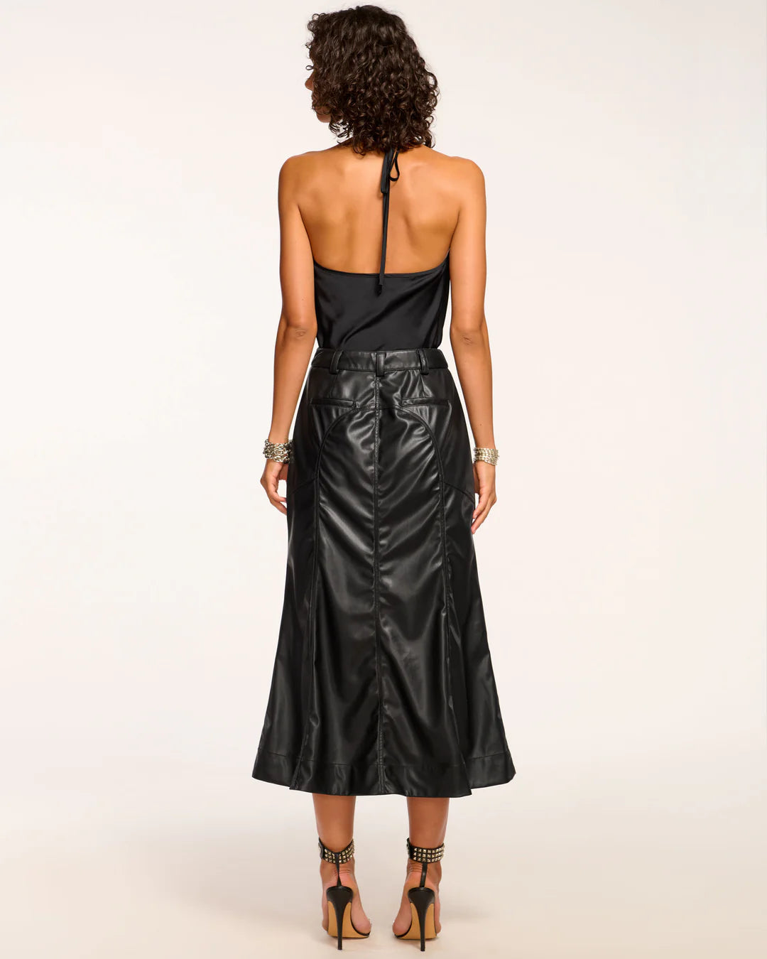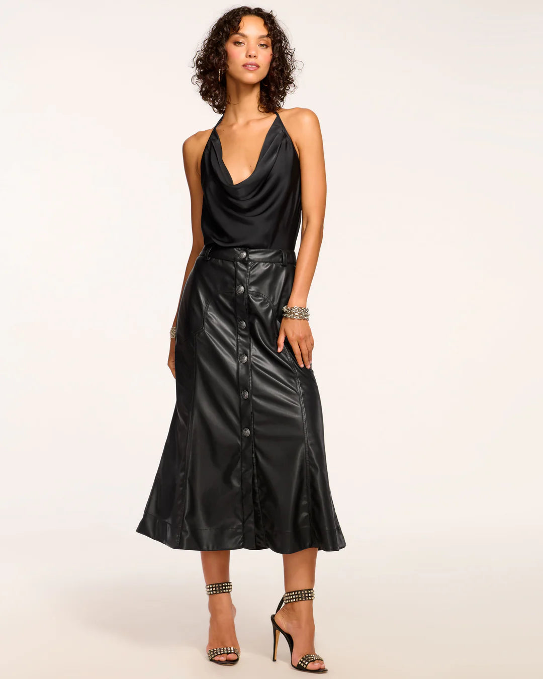 Rock your edge in the Dale faux leather midi skirt. This button-down midi skirt will catch eyes, while being a staple silhouette in your closet. Pair it with a white t-shirt, or dress it up with a sleek black top and some boots and you'll be the coolest in the room.