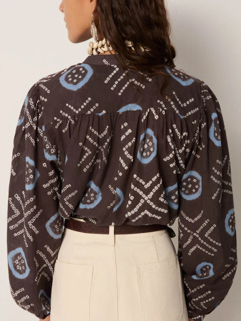 100% cotton voile blouse, cut loose with a soft drape, patterned in hand–dyed geometrics. Circles framed in sky blue and dotted crosses run across a dark ground, the irregularity of each mark carrying the imperfect rhythm of craft. The voile is airy and translucent, cool against the skin. Its loose drape creates a sense of ease while retaining structure at the shoulders. Designed with a straight placket, band collar, and wide sleeves gathered into cuffs. The print falls unevenly, giving each blouse its own unique alignment.