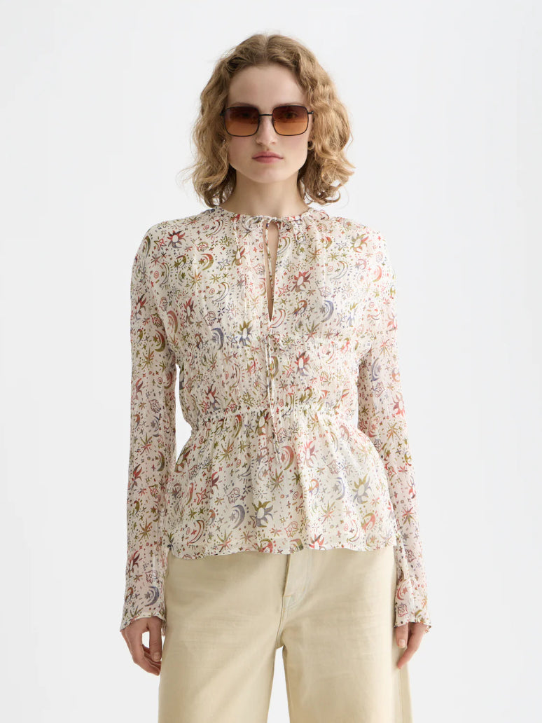 This woven top featuring a hand painted print, finished with a front tie for a relaxed, feminine touch.