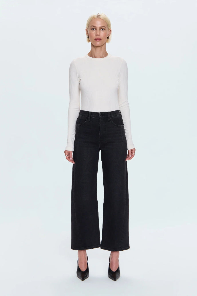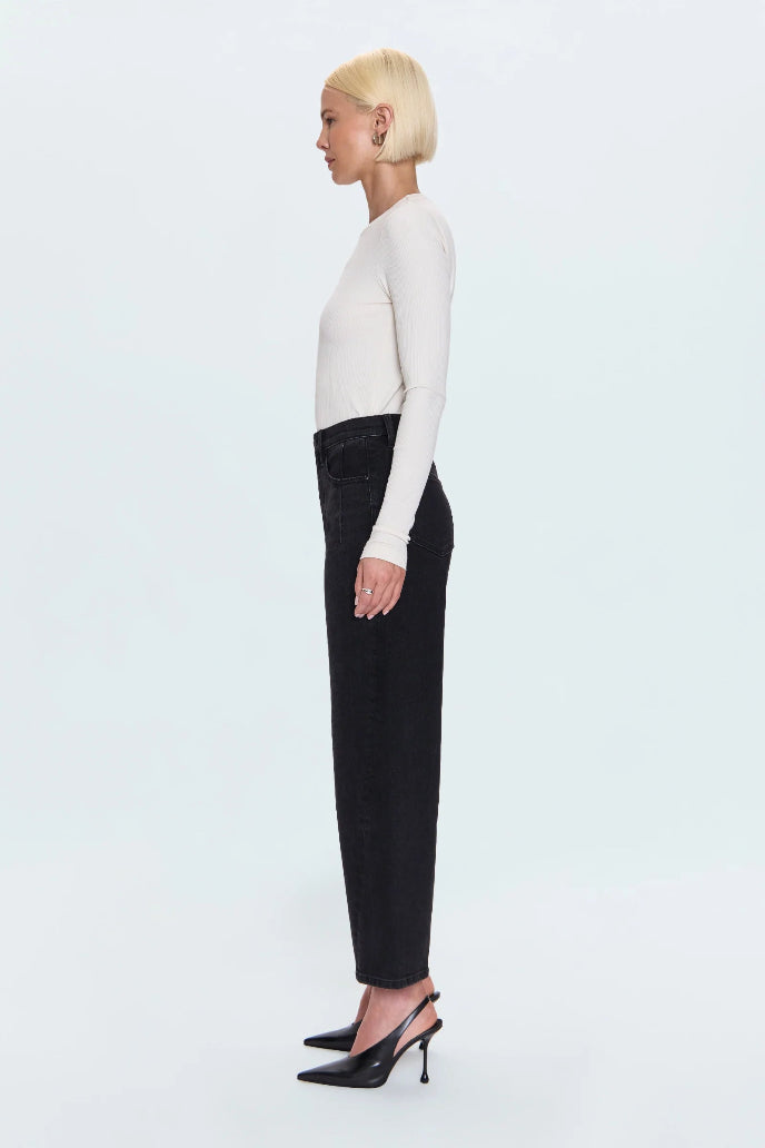 A new must-have jean, Kyra features a high rise, signature bowed leg, and cropped 28" inseam for a fresh, sculpted shape. The forward-twisted seam and refined back yoke add subtle dimension and structure. Crafted from comfort stretch denim in Jetset, a sleek black wash with timeless versatility.
