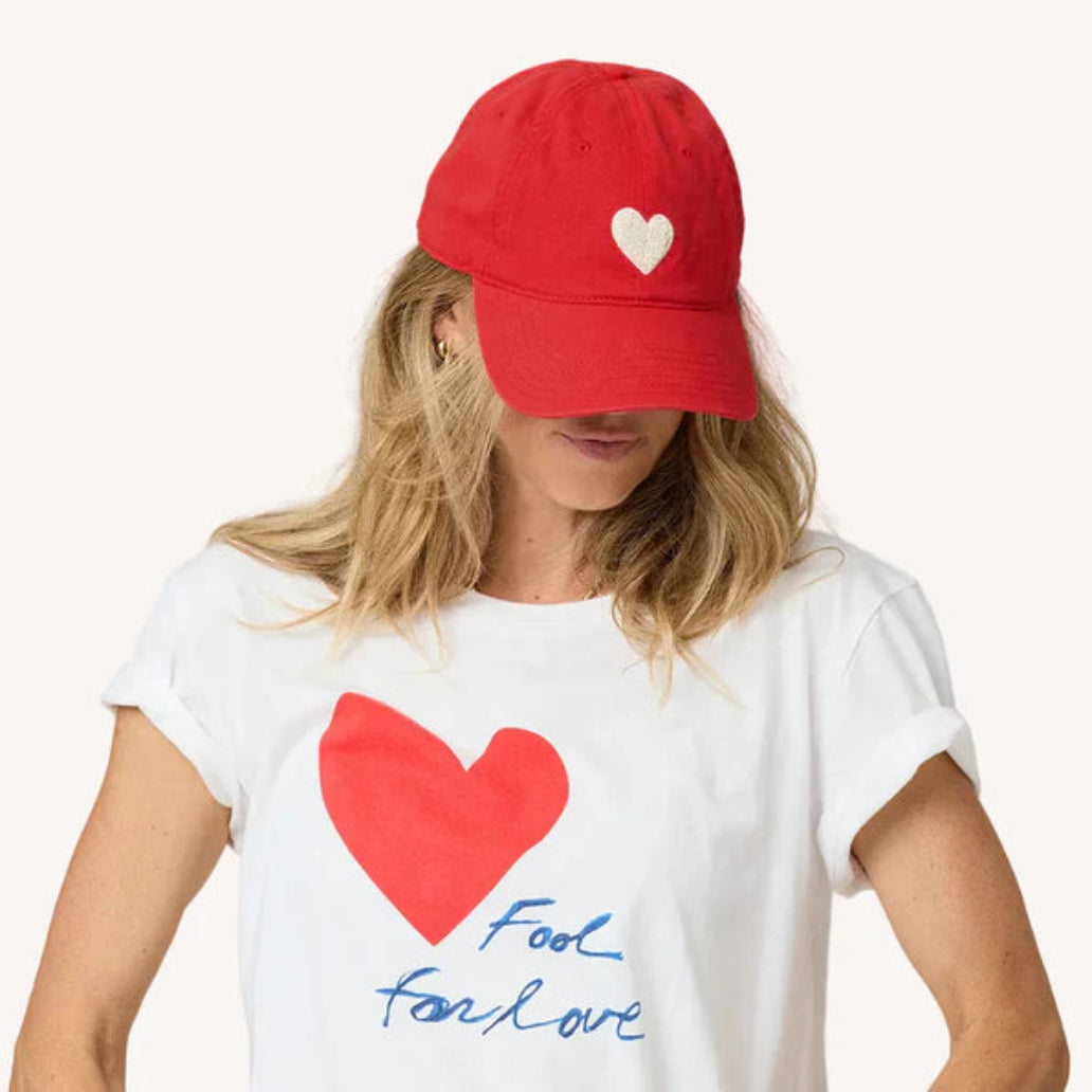 KR's Imperfect Chenille Heart Hat, made from cotton-twill in bright red with Kerri's Imperfect Heart Patch in chenille on the front and her embroidered 'loved' over the adjustable tab at the back. It'll make any outfit you style it with look effortlessly cool.
