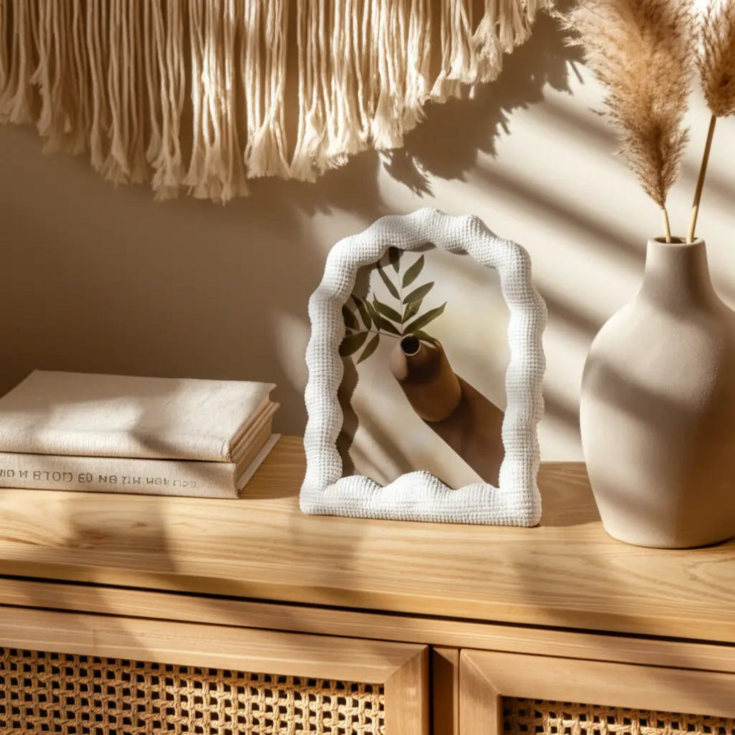 Elevate your home decor with this white boho resin picture frame featuring an organic, textured finish. Its artistic, sculpted edges add a trendy, handmade look, making it perfect for creating a cozy, modern bohemian vibe. Crafted from durable, high-quality resin, this picture frame ensures long-lasting beauty without warping or fading. The sturdy design protects your treasured photos while maintaining a lightweight, elegant feel.