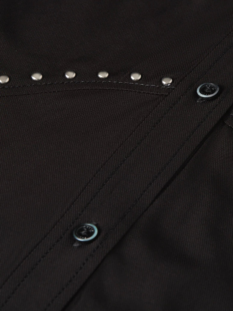 A studded button-front midi dress with structured lines, offering a refined, understated statement.